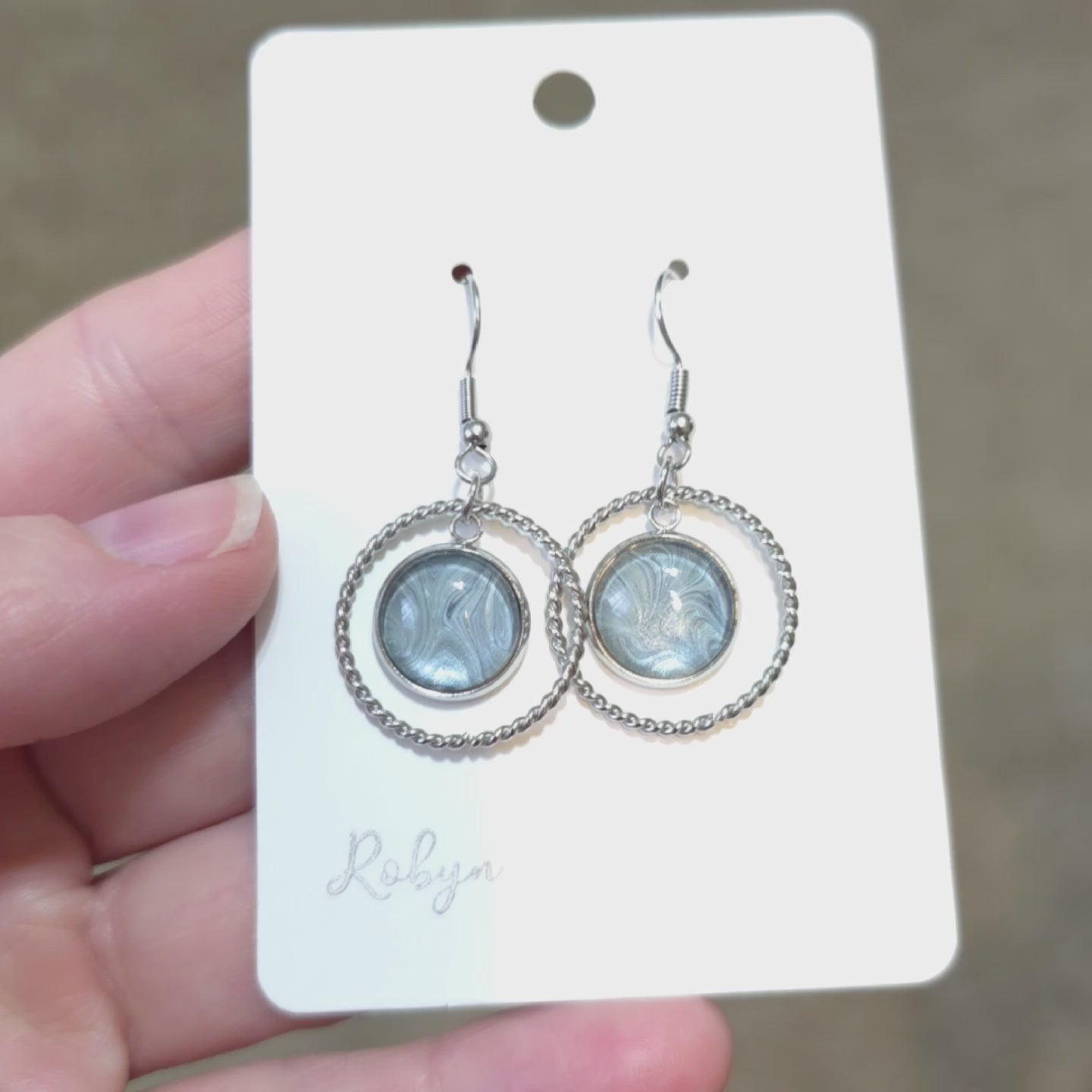 Crafted with precision, these stainless-steel hoop earrings showcase a sophisticated interplay of blue and gray tones beneath protective glass cabochons. The sealed artwork delivers exceptional visual depth while maintaining color integrity over time. Engineered from corrosion-resistant stainless steel, they're designed for reliable daily wear without compromise to aesthetics or durability.