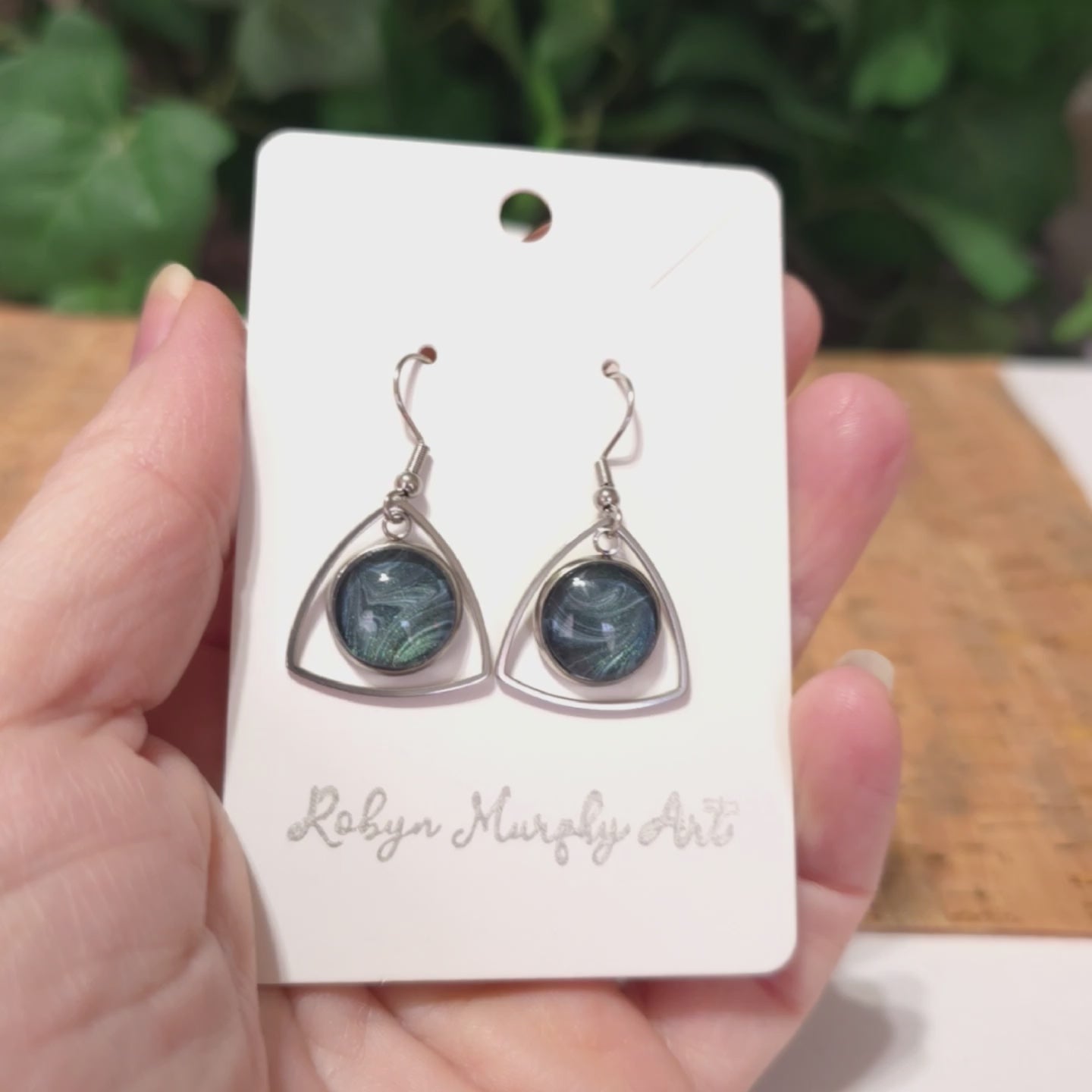 These distinctive dangle earrings showcase original hand-painted acrylic art rendered in moody tones of deep blue and emerald green. A protective glass cabochon encases the artwork, preserving its vibrancy and adding dimensional depth to the composition. Built with stainless steel components, they resist corrosion and maintain their structural integrity through regular wear. The pieces balance refined subtlety with bold visual impact, making them equally at home in minimalist aesthetics or as focal points in curated collections. Ideal for those who value handcrafted artistry combined with dependable, durable construction.
