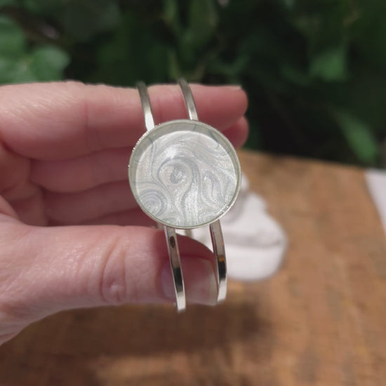 Crafted with precision, this silver-plated bangle showcases an artisan hand-painted bezel rendered in captivating blue and pearl tones that shimmer beautifully under light. The piece transitions seamlessly between everyday wear and special occasions, offering versatile styling potential. A complimentary polishing cloth ensures your bracelet maintains its lustrous finish for years to come.