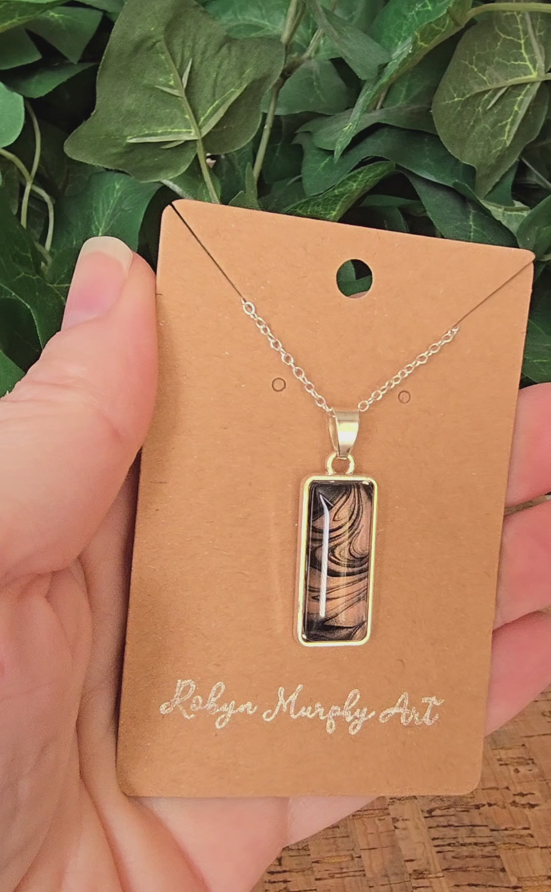 This refined pendant necklace features a hand-painted bezel in rose gold and black tones, sealed beneath a protective glass cabochon that enhances the artwork's luminosity. Suspended from an 18-inch silver plated chain, the piece combines sophisticated design with lasting quality. Each purchase includes a polishing cloth to maintain the necklace's lustrous finish.