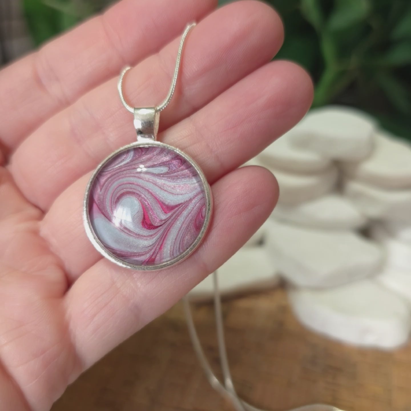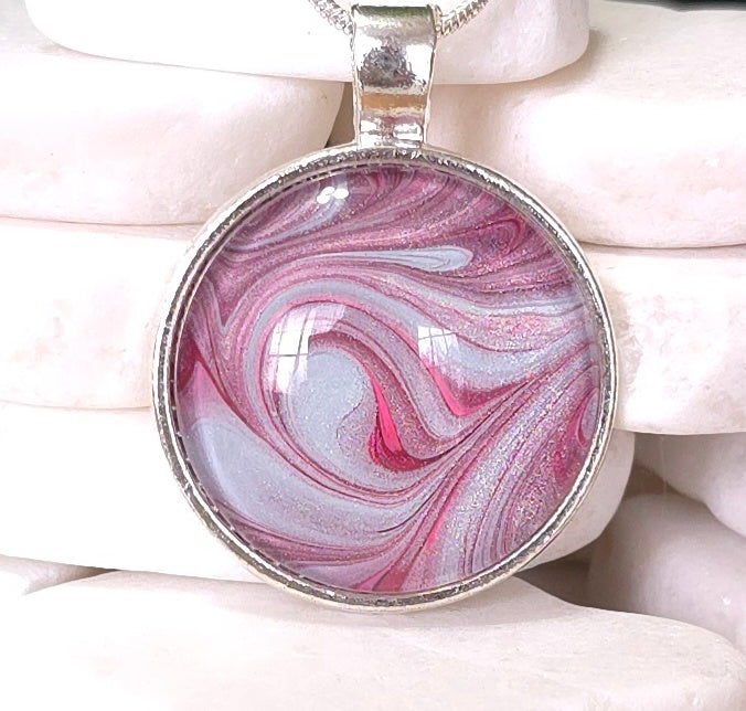 This Silver Plated Pendant Necklace boasts a distinctive bezel design that showcases a captivating acrylic paint skin in a stunning blend of pink and blue shades. The necklace appears to shimmer under light and is enclosed under a glass cabochon for protection. You can wear this necklace gracefully, as it hangs from an 18-inch silver plated snake chain. To preserve its sparkle, a polishing cloth is included.