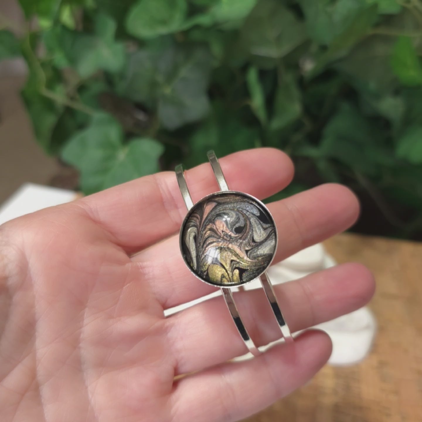 This bangle is plated with silver and adorned with a hand-painted bezel featuring the colors black, gold, and rose gold. It reflects light beautifully and comes with a polishing cloth to maintain its vibrant appearance.