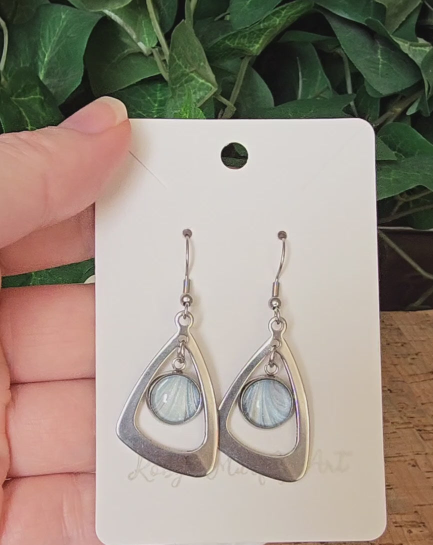 These pendant dangle earrings showcase hand-painted acrylic artwork in serene gray-blue tones, encased beneath a protective glass cabochon that preserves color vibrancy and adds dimensional depth. Built from corrosion-resistant stainless steel, they're engineered for durability and extended wear. The design balances refined subtlety with bold presence, making them equally suited to minimalist styling or as a focal point piece. An ideal choice for those who value artisanal craftsmanship combined with practical, everyday functionality.