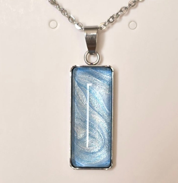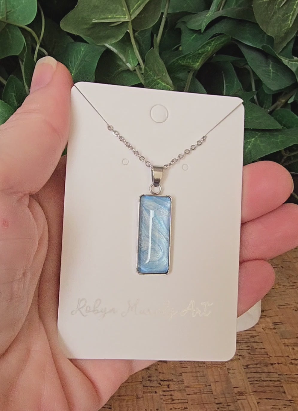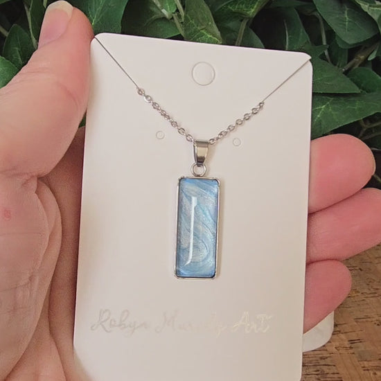 This refined pendant necklace features a hand-painted bezel in soft blue and silver tones, sealed beneath a protective glass cabochon that enhances the artwork's luminous finish. Constructed entirely from stainless steel, including an 18-inch chain, the piece combines artistic craftsmanship with lasting durability and corrosion resistance. Each necklace arrives with a polishing cloth to maintain its pristine appearance over time.